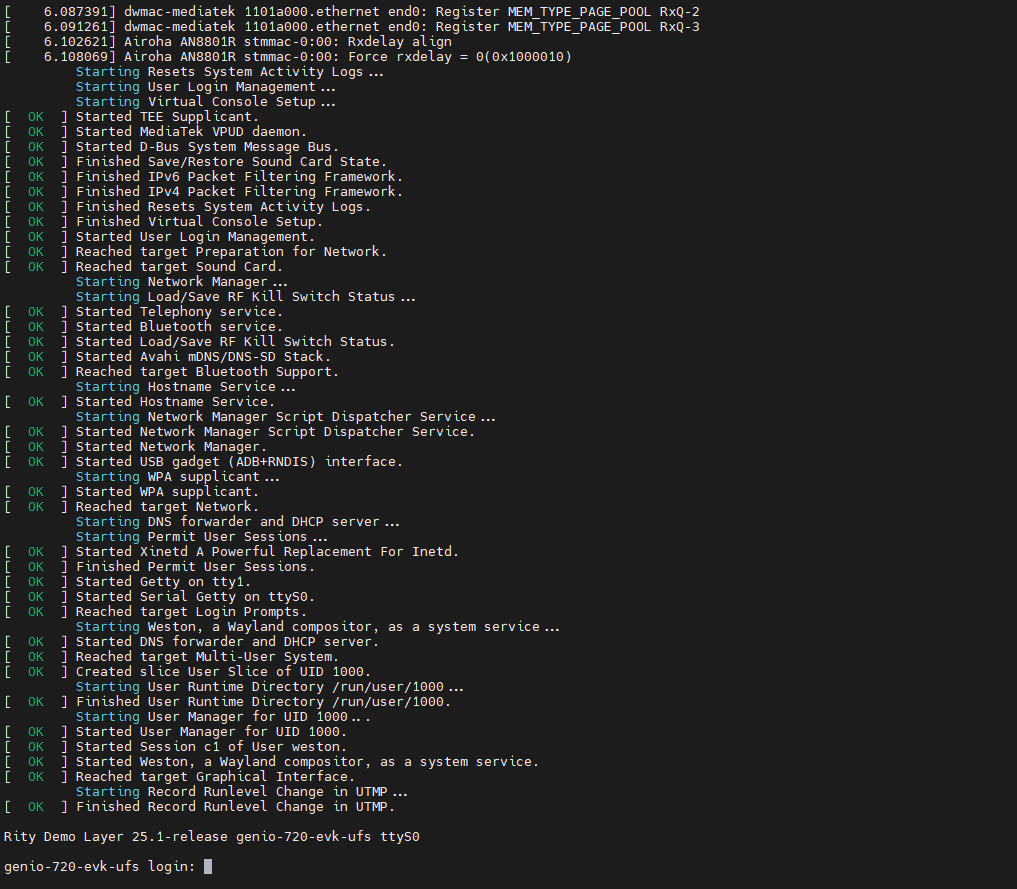 Once board has fully booted, a login prompt is sent across UART0 similar to that shown below.