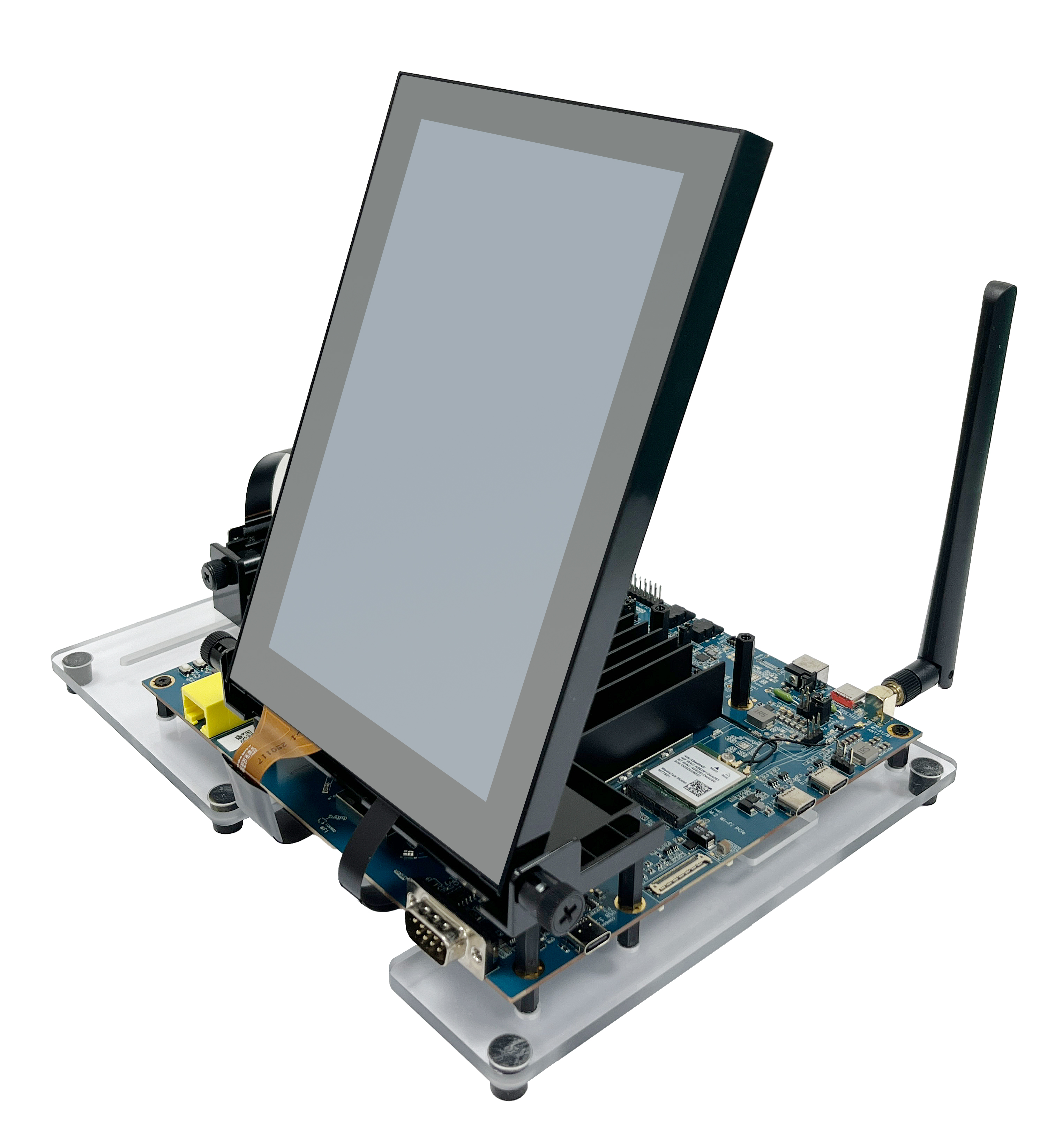 The kit ships with an attached MIPI-DSI 7” 1920*1200 LCD with touch screen. It also includes two separate camera boards.