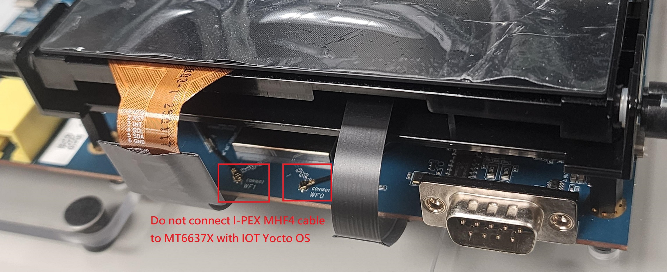 A MT6637X Wi-Fi (Wireless Fidelity)/BT Combo chip is on board. Android OS only uses this, and IoT Yocto does not support this chip. Please also double check the I-PEX MHF4 cable is not connected to the MT6637X if you’re using IoT Yocto OS.