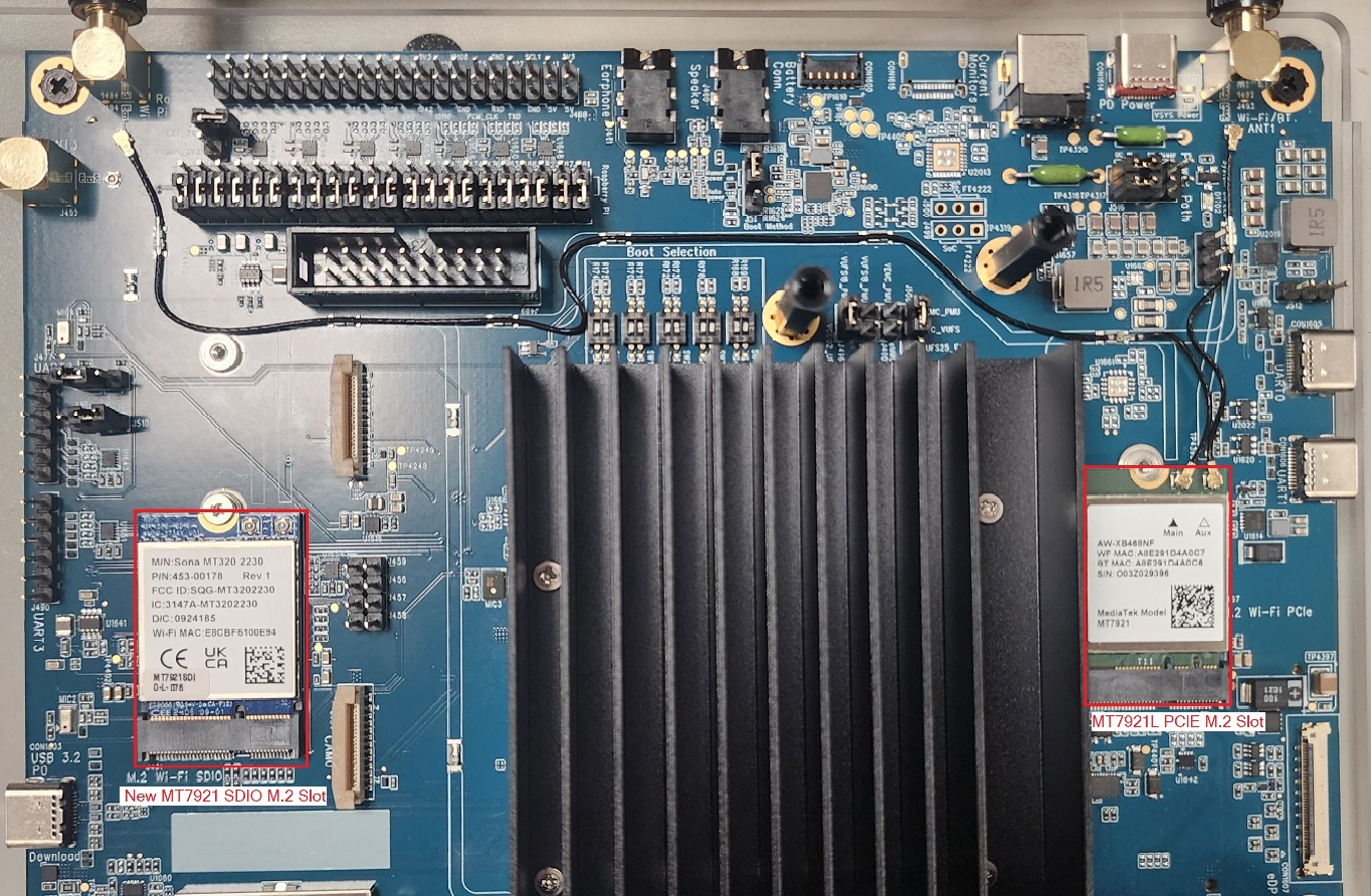 The Genio 520/720-EVK has an AzureWave MT7921L M.2 PCIe card and a Sona MT320 MT7921 SDIO M.2 card installed.