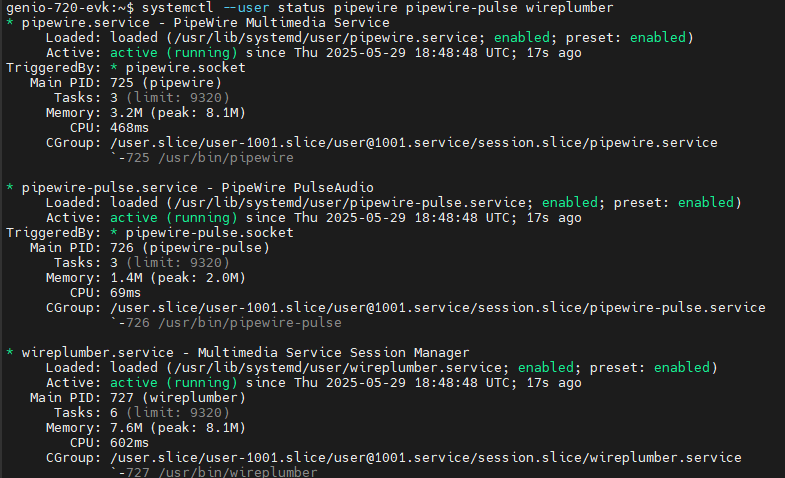 systemctl --user status pipewire pipewire-pulse wireplumber