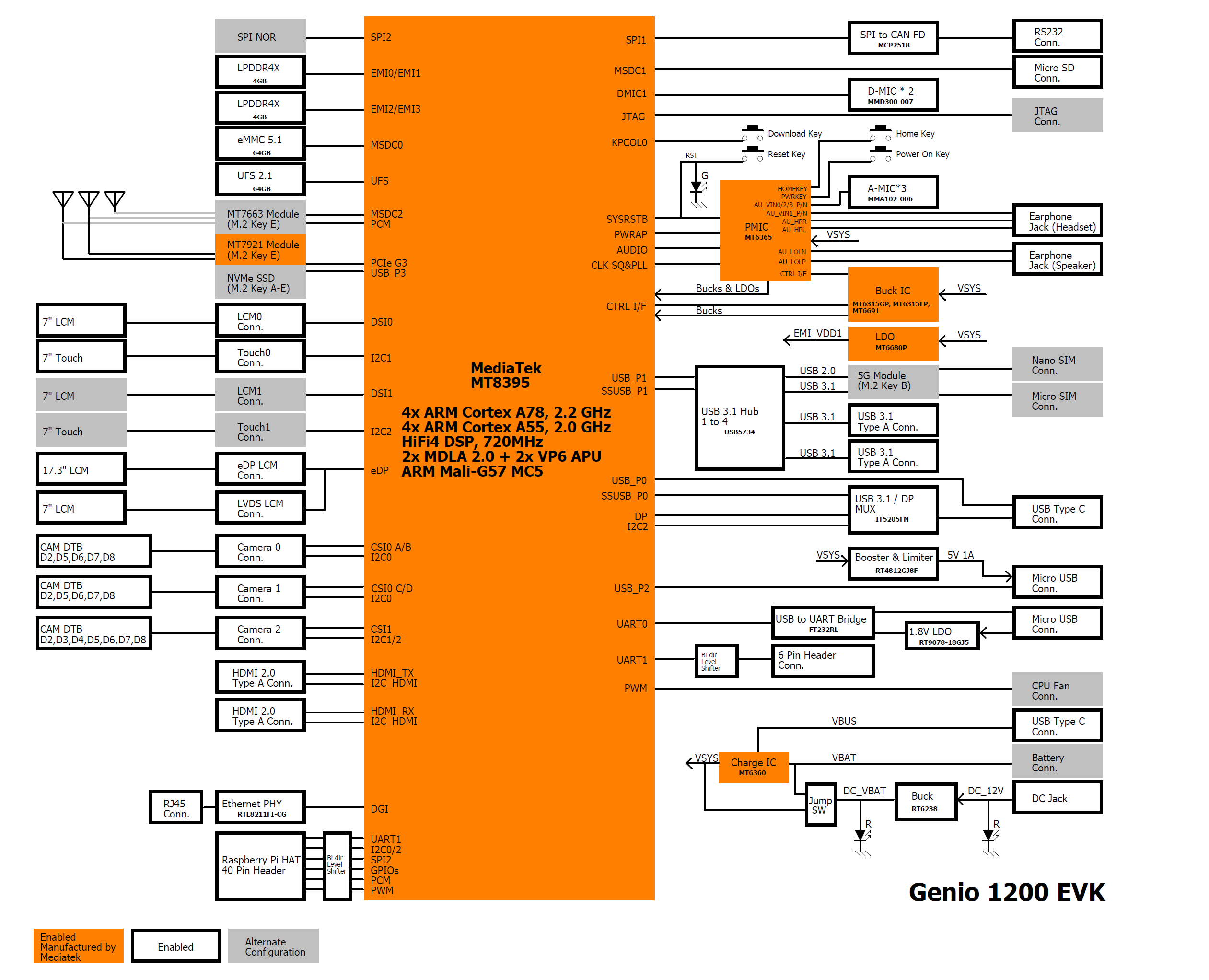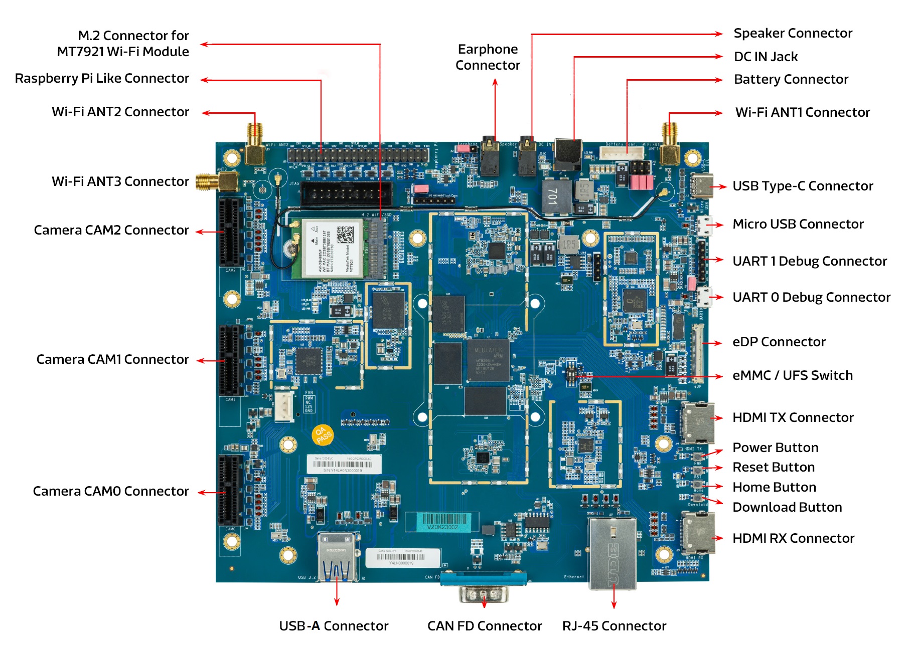 This evaluation kit is suitable for our technology partners to evaluate the MT8395 processor for solution design and development. This section describes board features that are relevant to IoT Yocto.