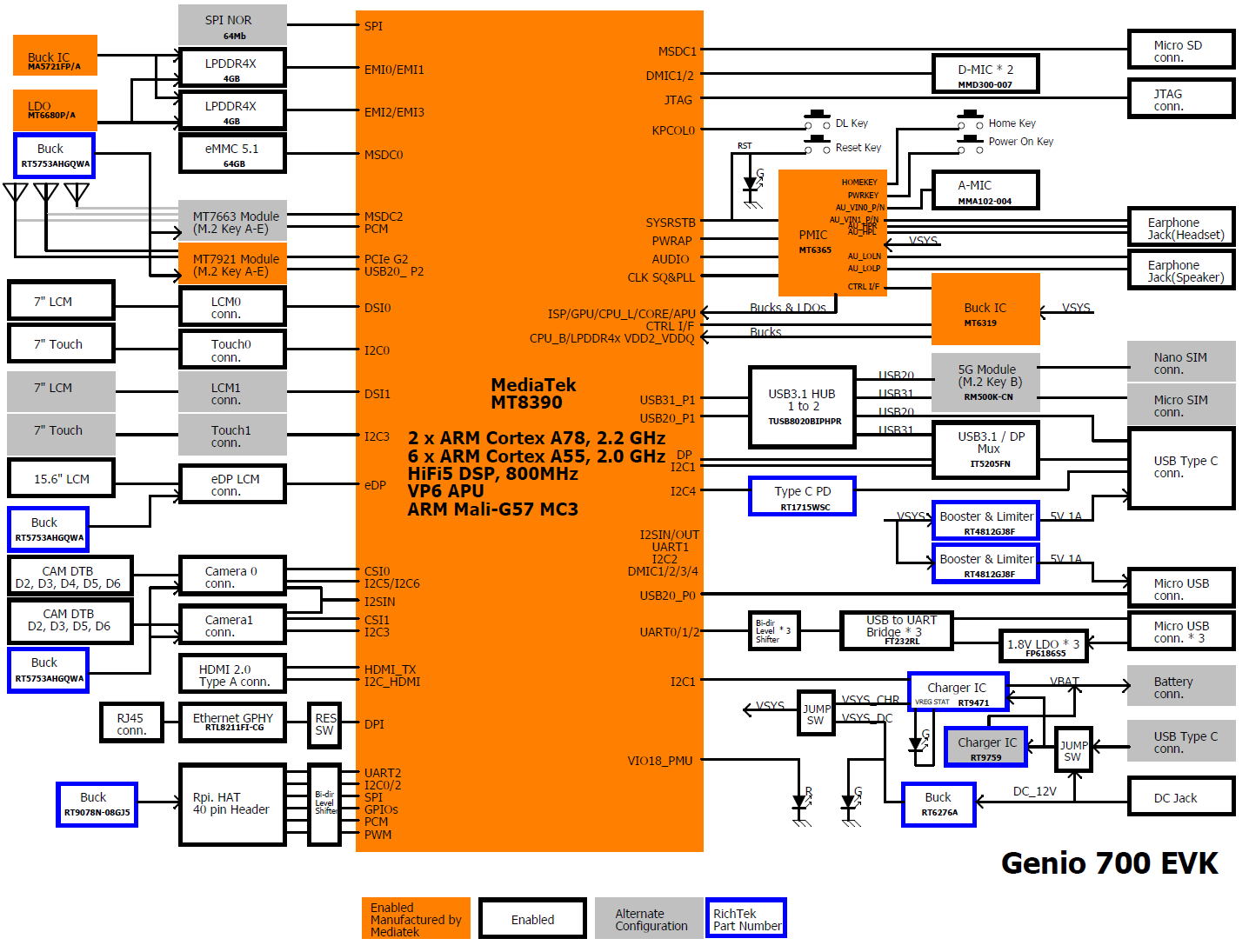 Genio 700-EVK board is an evaluation kit of MediaTek MT8390 platform, which is a high performance IoT platform with rich features. This section describes board features that are relevant to IoT Yocto.