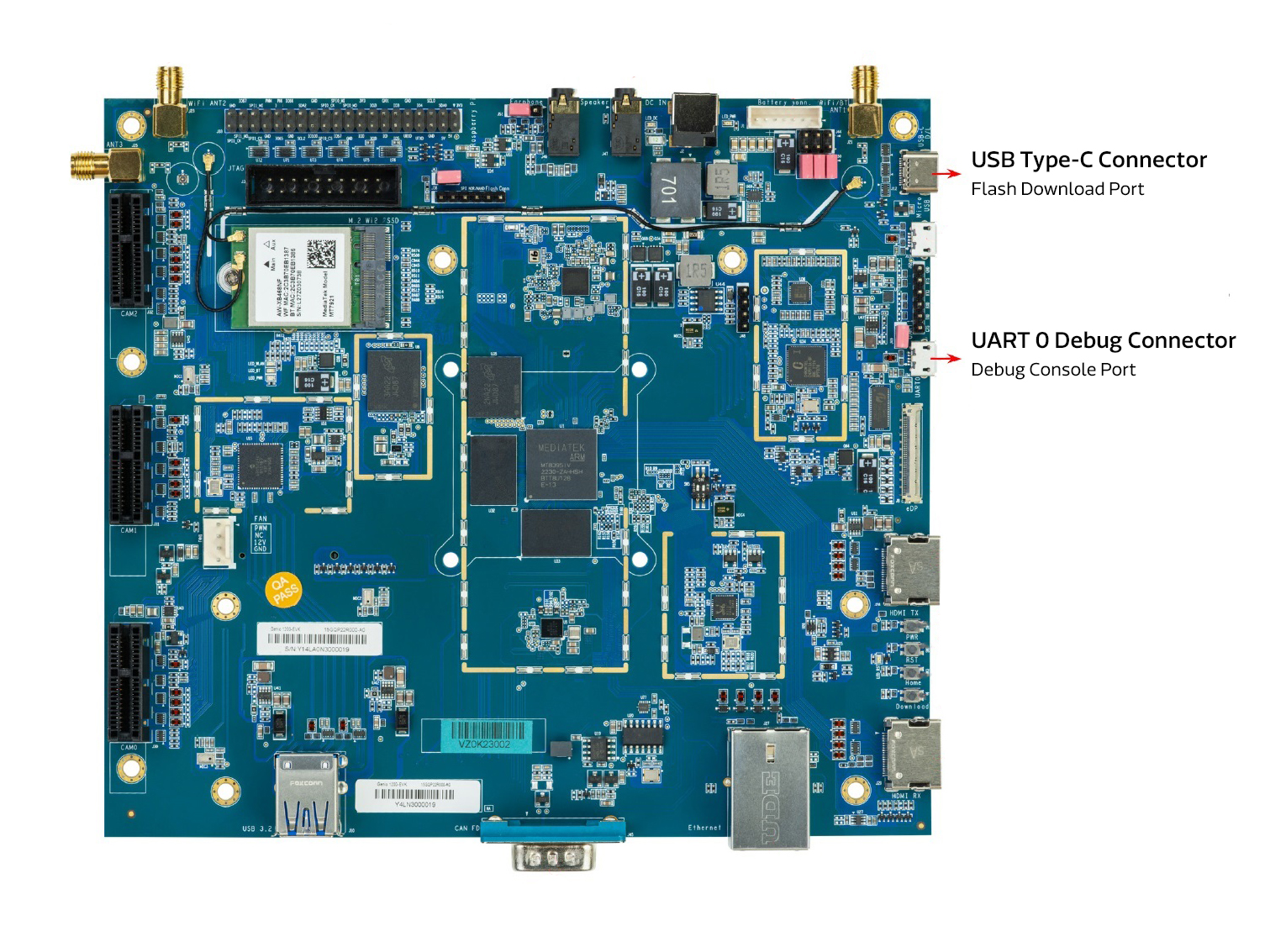 Connect a USB cable to connector labeled USB Type-C Connector Flash download port as shown in the image USB Port Locations below: