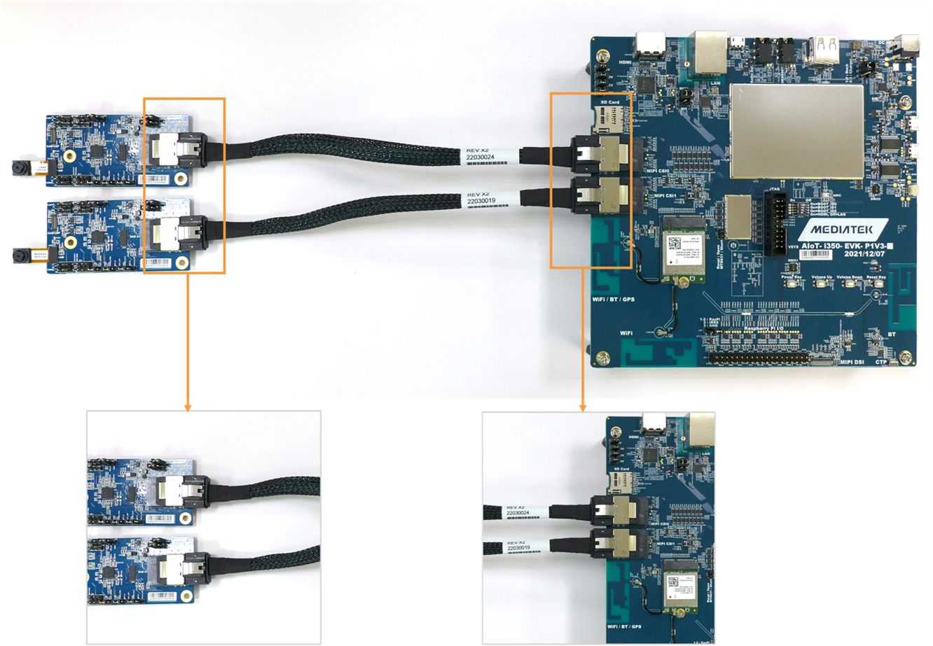 Insert Mini-SAS Cable into the corresponding connectors of the Genio 350 EVK mainboard and Camera board.