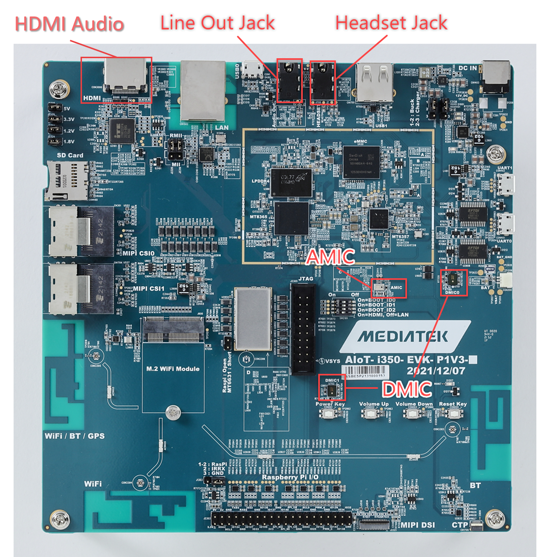 One line-out jack is used for the external amplifier. One headset jack can be connected to the earphone which has both playback and capture functions. AMIC is a mono analog microphone on the board. DMIC is a stereo digital microphone on the board.