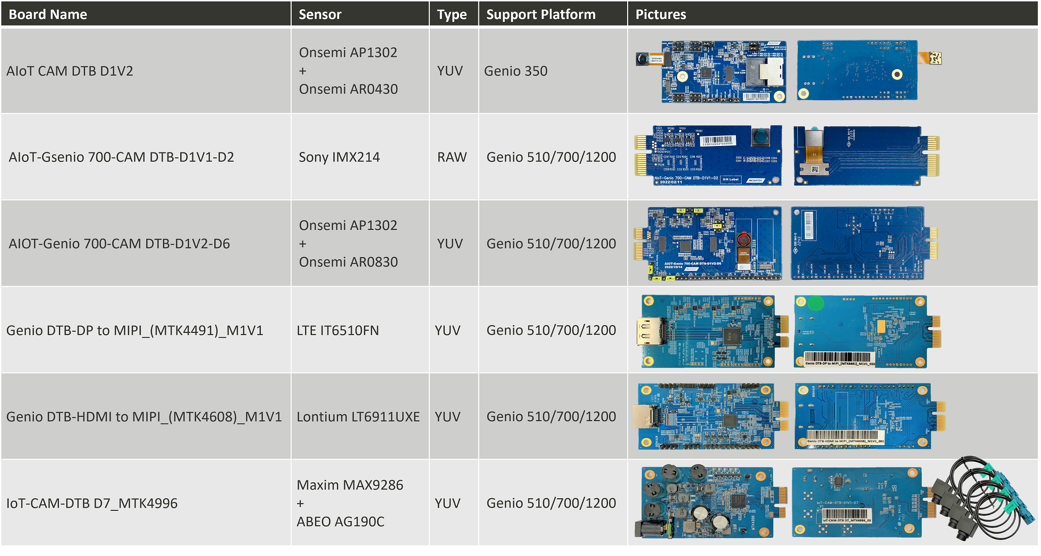 The following tables and figures show all the supported sensors on each Genio series platform.