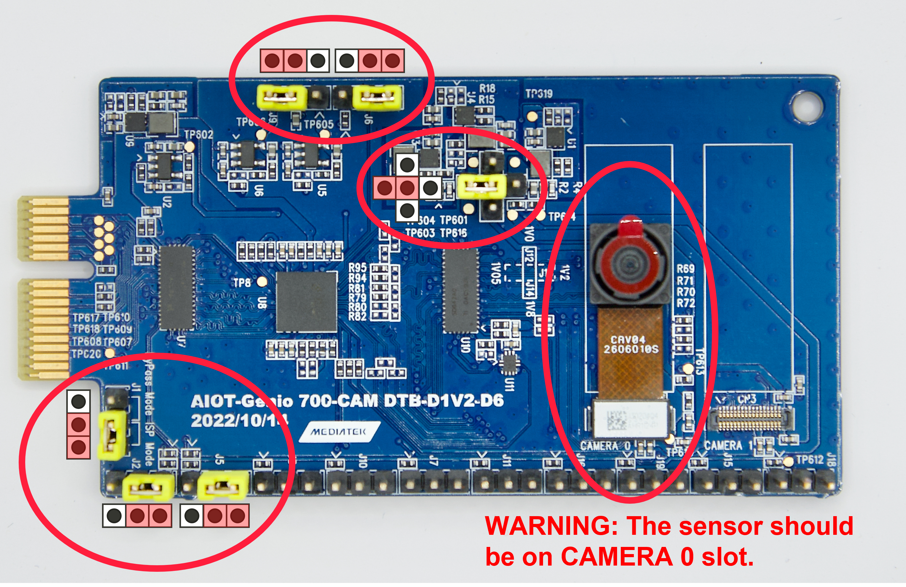 To configure the camera DTB D6 to ISP mode, you MUST set 6 jumpers and 1 camera sensor as shown in the figure below. The jumpers MUST be correctly set and the camera sensor MUST be connected to the CAMERA 0 slot.