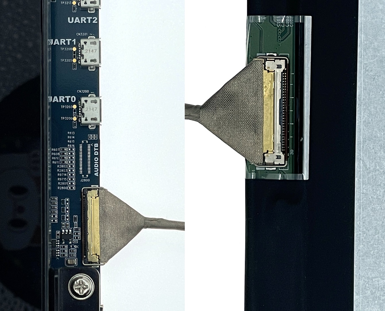 Turn both the EVK and the daughter board to the front side, then connect the LVDS cable to the daughter board.