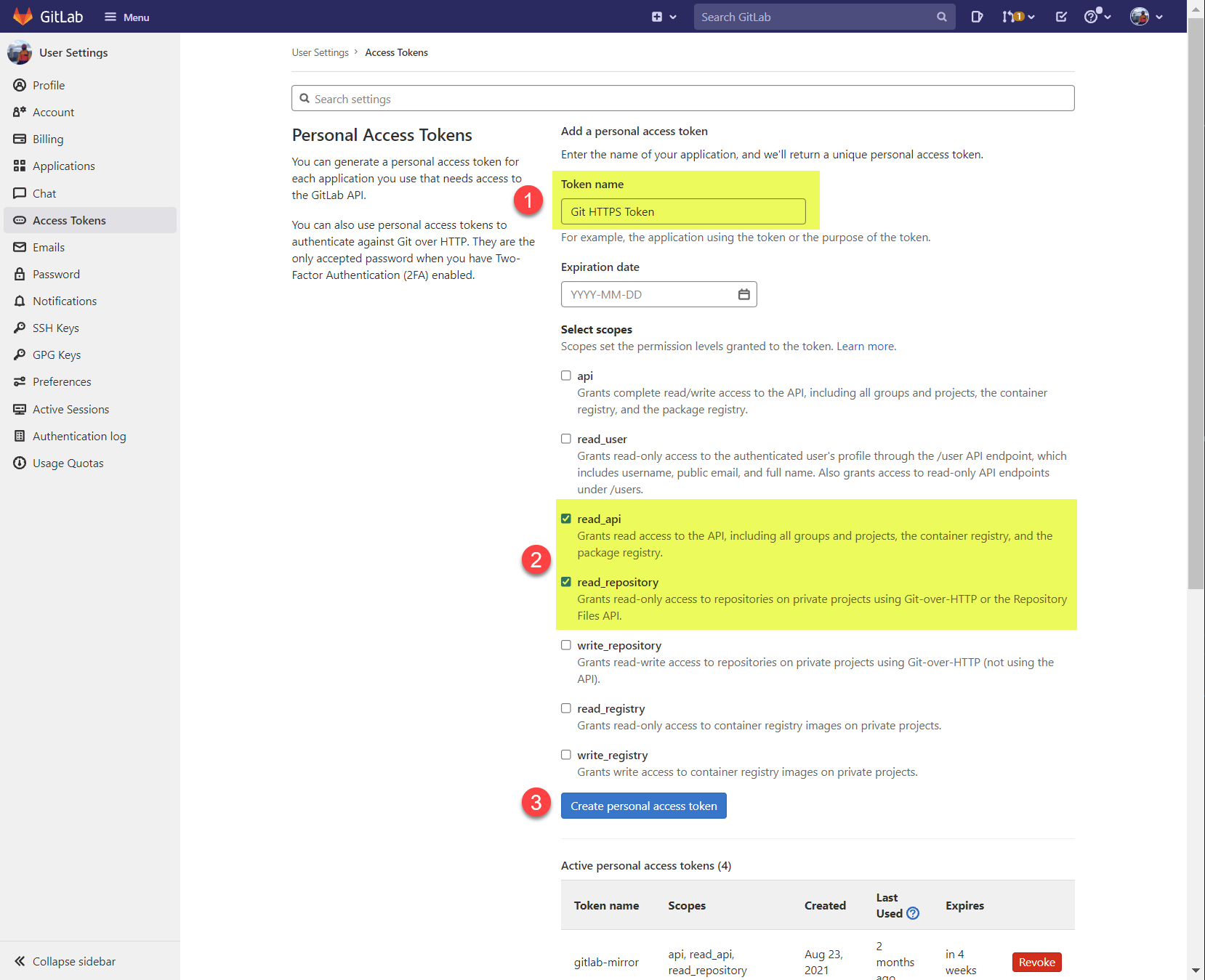 Use your GitLab username and this token as the git HTTPS username and password if prompted in the rest of the steps in this guide.
