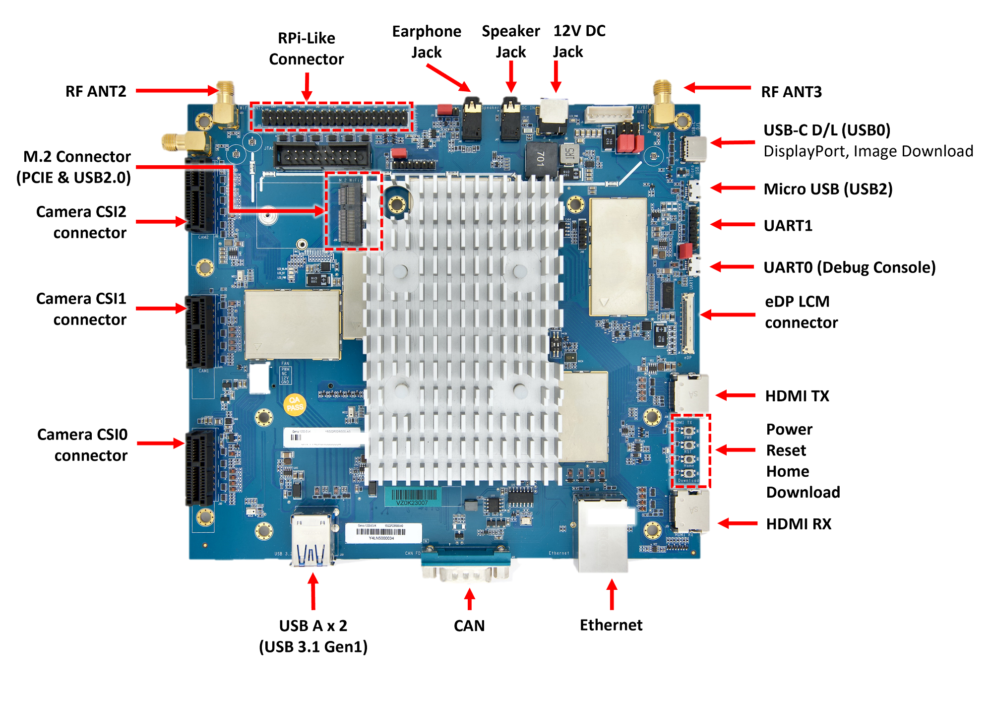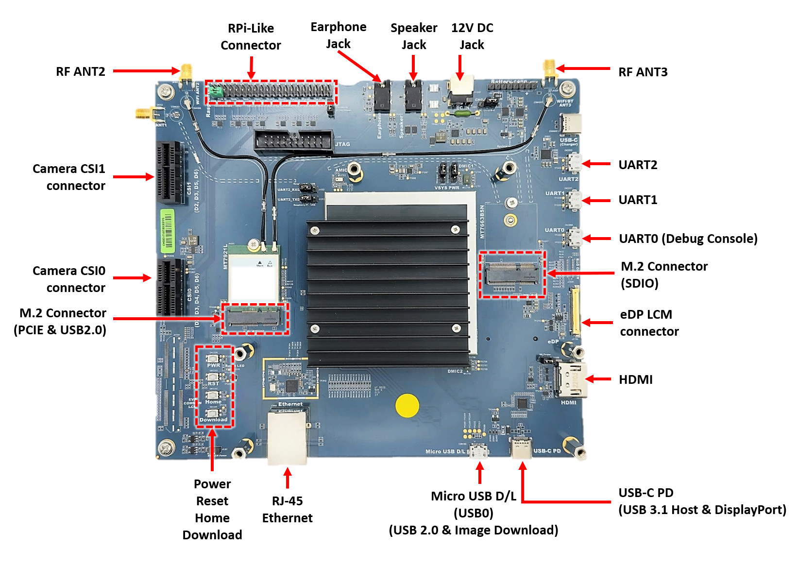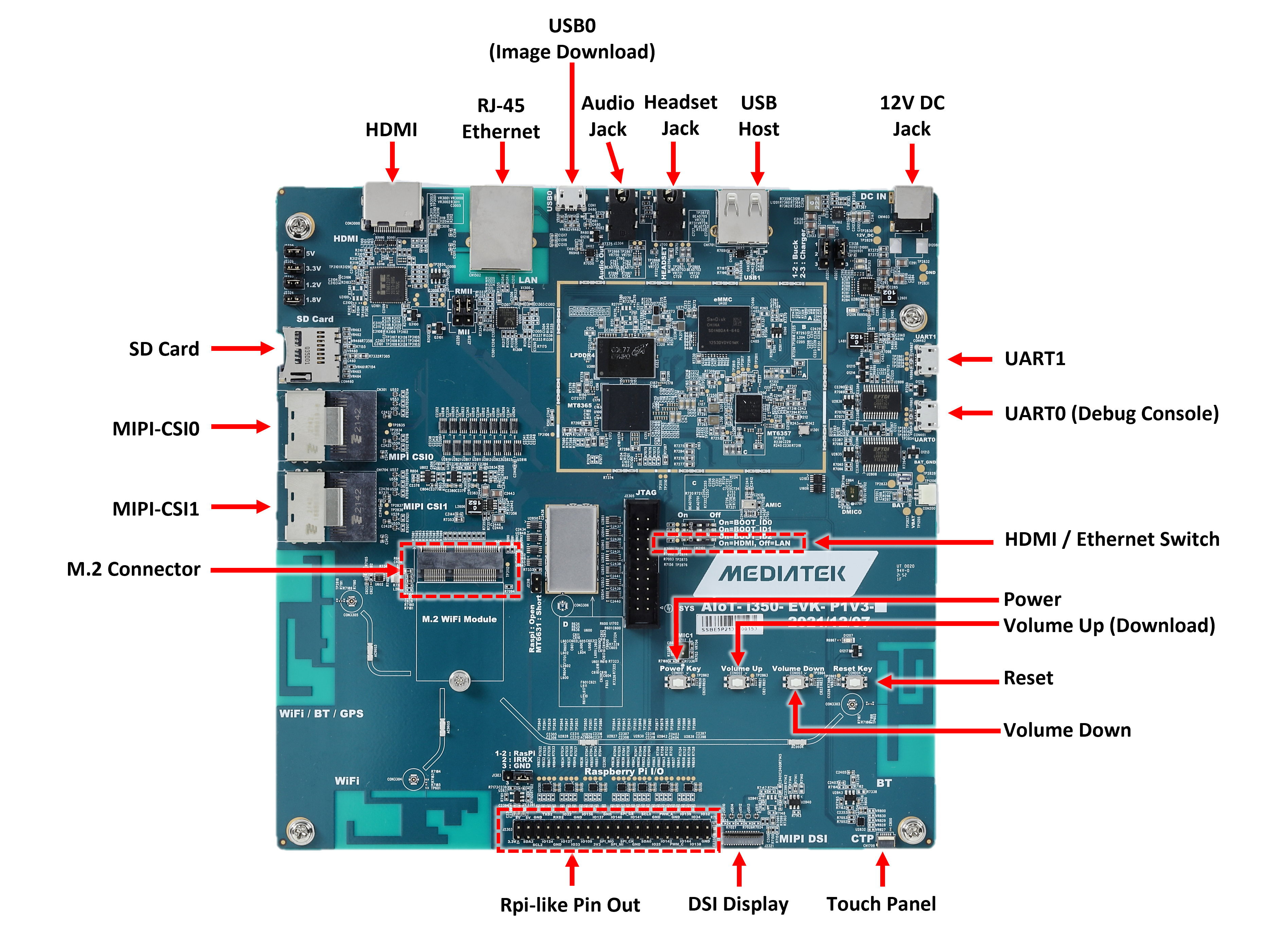 UART Port: The UART port provides access to Boot ROM, bootloader and kernel console access in IoT Yocto. This design is shared across all Genio EVKs.