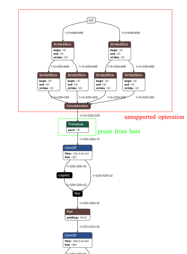 ncc-tflite --arch=mdla3.0 yolox_s_quant.tfliteOP[2]: STRIDED_SLICE ├ MDLA: Last stride size should be equal to 1 ├ EDMA: unsupported operation ├ EDMA: unsupported operation OP[3]: STRIDED_SLICE ├ MDLA: Last stride size should be equal to 1 ├ EDMA: unsupported operation ├ EDMA: unsupported operation OP[4]: STRIDED_SLICE ├ MDLA: Last stride size should be equal to 1 ├ EDMA: unsupported operation ├ EDMA: unsupported operation OP[5]: STRIDED_SLICE ├ MDLA: Last stride size should be equal to 1 ├ EDMA: unsupported operation ├ EDMA: unsupported operation ERROR: Cannot find an execution plan because of unsupported operations ERROR: Fail to compile yolox_s_quant.tflite