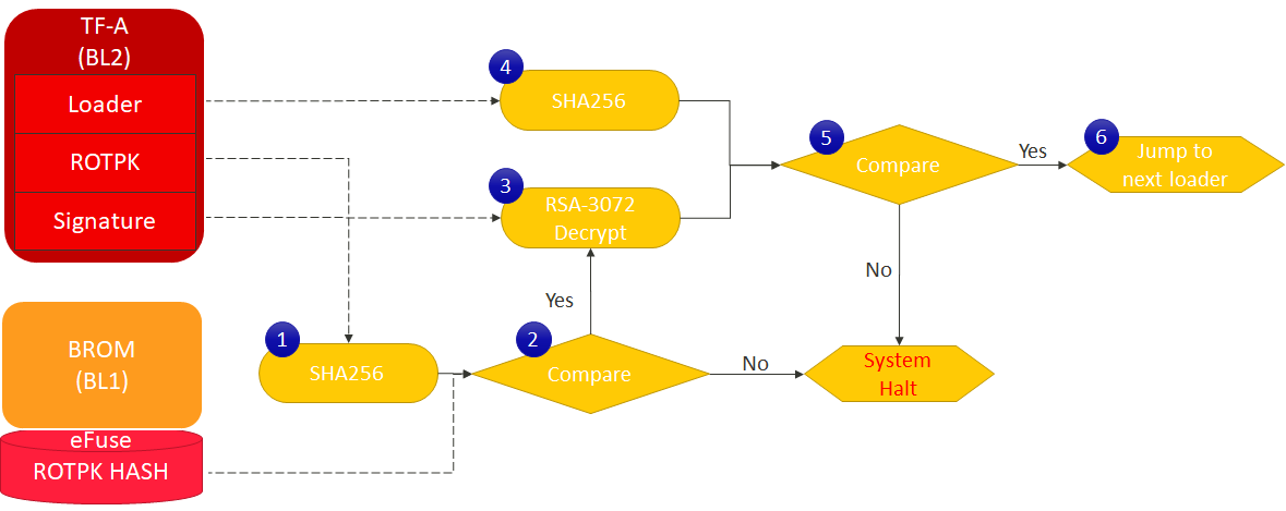 & 6. If the comparison succeeds, the system jumps to BL2 loader. Otherwise, the system halt.