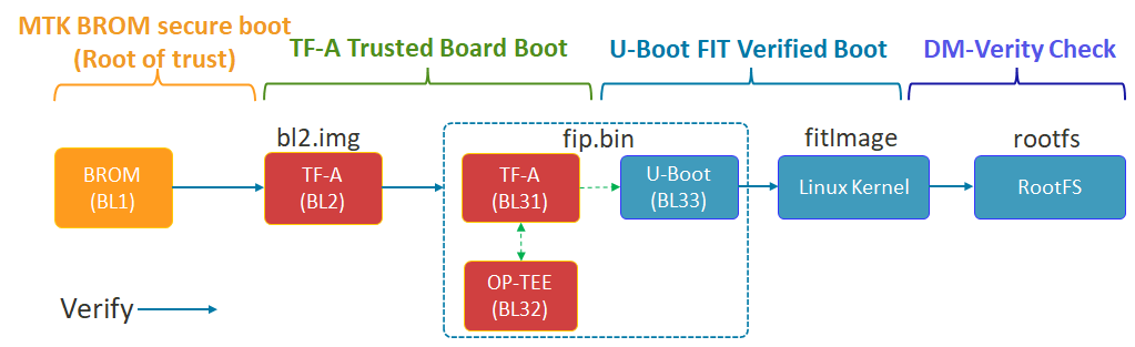 ) which includes TF-A (BL31), OP-TEE (BL32) and U-Boot (BL33) with TF-A Trusted Board Boot mechanismU-Boot (BL33) verifies Linux Kernel image with U-Boot FIT Verified Boot mechanism