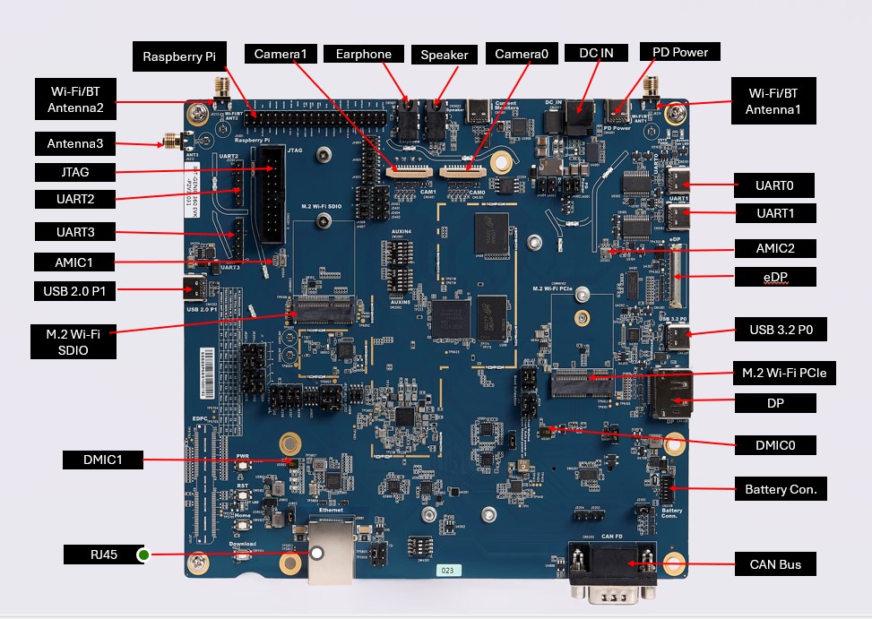 M.2 Slot Key E x 2 - For AzureWave AW-XB468NF Wi-Fi 6 & BT 5.2 Module - For Sona MT320 2230 Wi-Fi 6 & BT 5.4 Module - The M.2 slot designed on the EVK complies with the M.2 standard pin definition. Please ask the customer to confirm whether their M.2 module meets the M.2 standard pin definition.