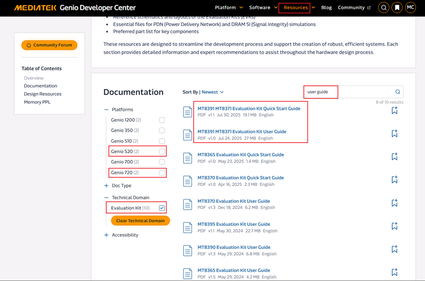 You are also welcome to use the search function to type ‘’User Guide’’, or use the filter ‘’Technical Domain’’ by choosing ‘’Evaluation Kit’’ in the Hardware Design Documentation section.