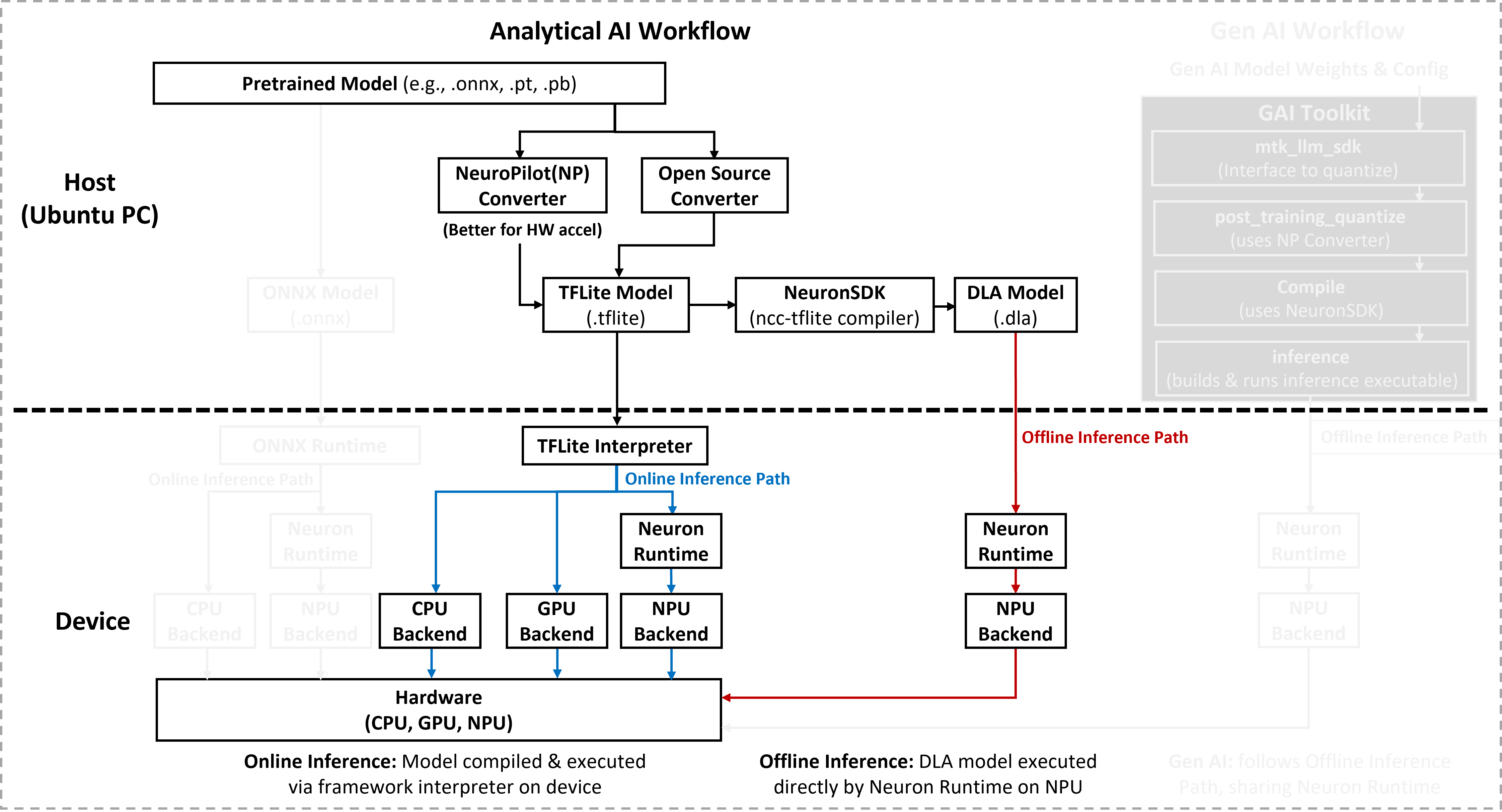 To prepare your own models for these paths (such as quantization or compilation), refer to AI Development Resources to obtain the required NeuroPilot SDKs and host tools.