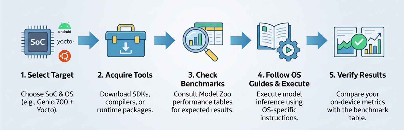 Before using the Model Zoo, developers should review AI Software Architecture, which describes the different AI inference paths in detail. This background helps align model selection, benchmarking, and deployment with the appropriate inference workflow on Genio platforms.