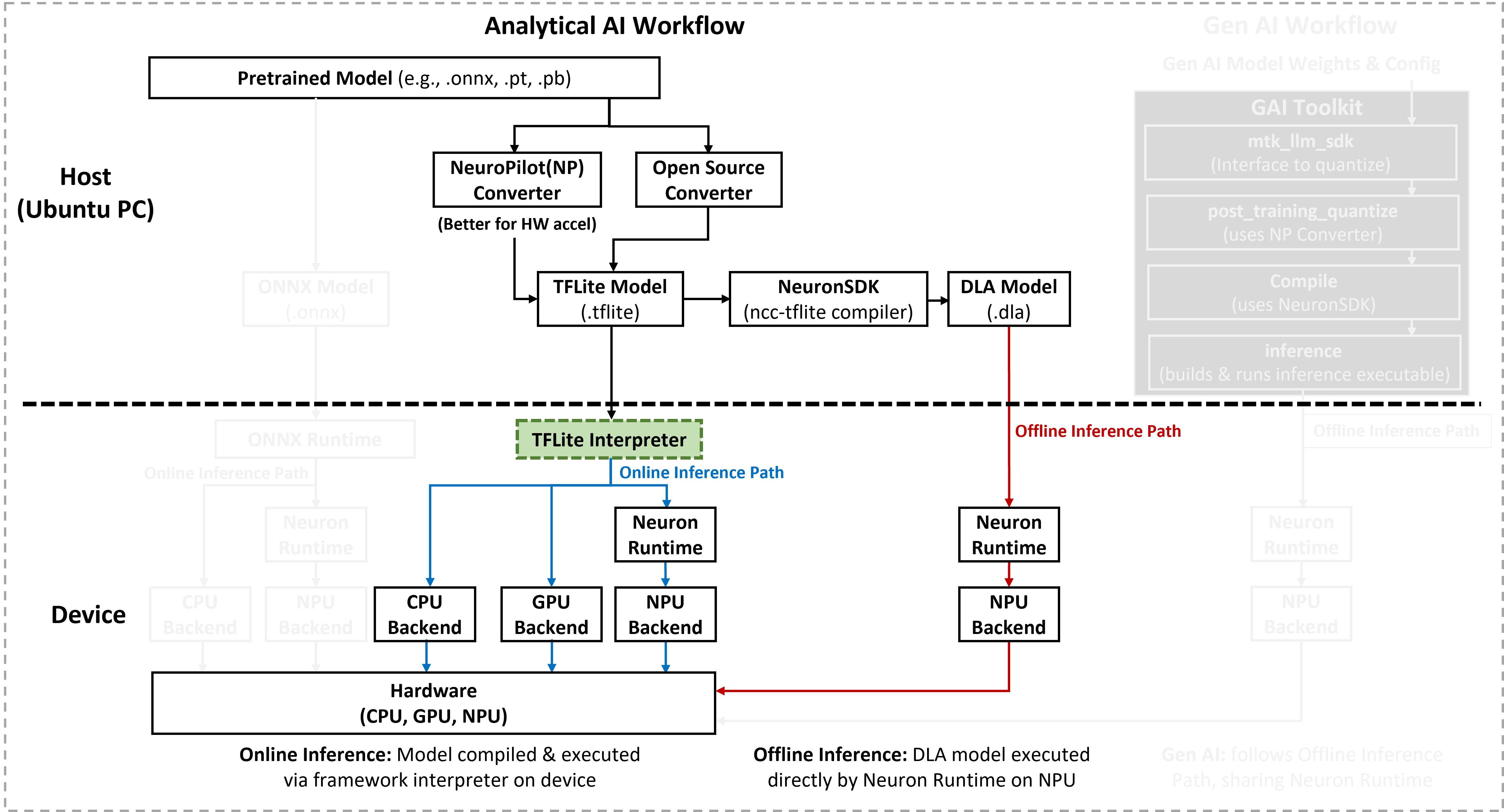 The following figure identifies the TFLite Interpreter as the core engine for online inference within the analytical AI path. While models are prepared on a host (PC), the Interpreter manages the final execution and hardware delegation on the Genio device.